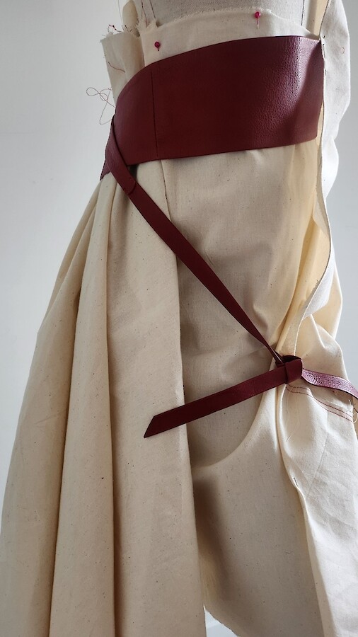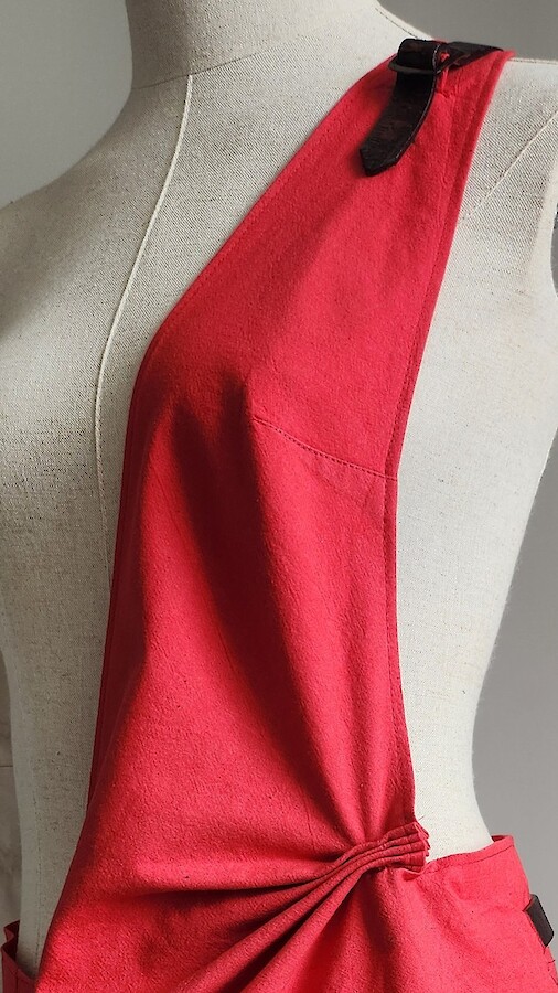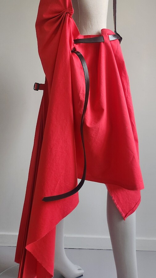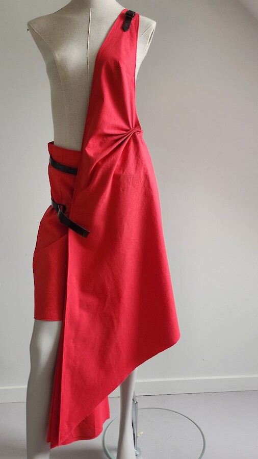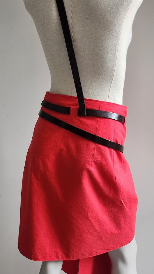 Robe rouge tablier asymétrique avec liens en cuir vernis rouge/noir