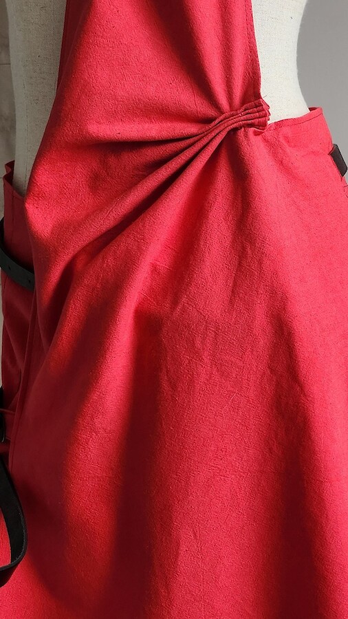 Asymmetrical red pinafore dress with red/black patent leather ties